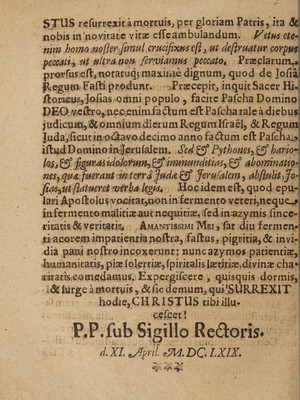 ![* , _ , - u STUS refurrexit amortuis, per gloriam Patris,ita & nobis indevitate vitas effe ambulandum. Vetus ete< ' nm homo nofkr Jimul crucifixus eft} ut defruatur corpfm peccati-, ut ultra non fer viamus peccato* Prasclarutru* prorfuseft, notatuq; maxime dignum, quod de Jofia! flegum Fafti produnt» .Pratcepir, inquit Sacer Hi-! Hornus, Jofias omni populofacite Pafcha Domino PE0 veUro,m?Aenimfa6tum eft Pafeharale a diebus judicum,dcomniumdierum RegumIfraei, &Regumi ]uda,‘ficut in odfavodecimo anno fa€ium eft Pafcha_» iftudDominoinJerufaiem* Se4& Pythones,&hario-i Iq$. figurMidohmm,& immunditias, gf abominatio• nes,qua fuerant mterrdfuda&> Jemfalem ,ab(lulitifioi Jias0tfrtueret verba legps* Hoeidem eft, quod epu-; lari Apoftoiusvooitat,n»nin'fermento veteri,neque^ infer mentomalitiasaut nequitias, sfedinazymis iince-: ritatis & veritatis, Amantissimi Mei , fat diu fermen¬ ti acorem impatientia noftra, faftus, pigritia, & invi-s dia pani noftroincoxeruntrnuncazymos patientias,] humanitatis, pia: iolertias,{piritalis laetitiae, divinas cha*i aatatiseomedamus. Expergifeere , quisquis dormis, & lurge a mortuis, & fic demum, quFSURREXIT hodie,CHRISTUS tibiillu- cefcet! d. XI Jfpril DO LX1X\](https://iiif.wellcomecollection.org/image/b31953645_0008.jp2/full/800%2C/0/default.jpg)