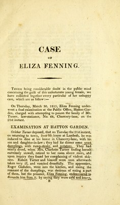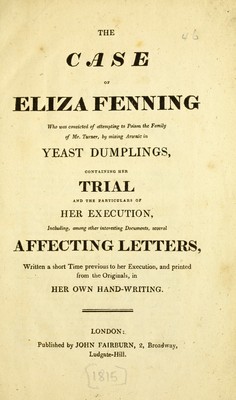 Credit: The case of Eliza Fenning who was convicted of attempting to poison the family of Mr. Turner by mixing arsenic in yeast dumplings : containing her trial, and the particulars of her execution, including ... several affecting letters written a short time previous to her execution / [Anon]. Source: Wellcome Collection.