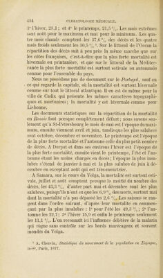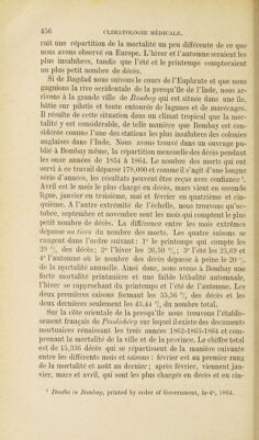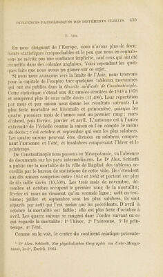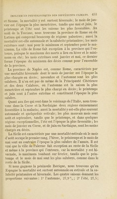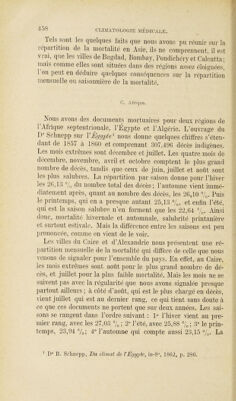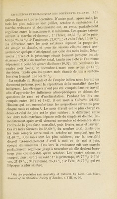 ![Tels sont les quelques faits que nous avons pu réunir sur la lépaitition de la mortalité en Asie, ils ne comprennent, il est \ lai, que les villes de Bagdad, Bombay, Pondichéry et Calcutta; niais comme elles sont situées dans des régions assez éloignées, l’on peut en déduire quelques conséquences sur la répartition mensuelle ou saisonnière de la mortalité. C, Afrique. Nous avons des documents mortuaires pour deux régions de 1 Afrique septentrionale, l’Égypte et l’Algérie. L’ouvrage du D Sclinepp sur VÉgypte^ nous donne quelques chiffres s’éten- dant de 1857 à 18GO et comprenant 307,496 décès indigènes. Les mois extrêmes sont décembre et juillet. Les quatre mois de décembre, novembre, avril et octobre comptent le plus grand nombre de décès, tandis que ceux de juin, juillet et août sont les plus salubres. La répartition par saison donne pour l’hiver les 26,13 7,) du nombre total des décès; l’automne vient immé- diatement après, quant au nombre des décès, les 26,10 7q. Puis le printemps, qui en a presque autant 25,13 7^, et enfin l’été, qui est la saison salubre n’en forment que les 22,64 7,. Ainsi donc, mortalité hivernale et automnale, salubrité printanière et surtout estivale. ]\Iais la différence entre les saisons est peu l)rononcée, comme on vient de le voir. Les villes du Caire et d’x\lexandrie nous présentent une ré- partition mensuelle de la mortalité qui diffère de celle que nous venons de signaler pour l’ensemble du pays. En effet, au Caire, les mois extrêmes sont août pour le plus grand nombre de dé- cès, et juillet pour la plus faible mortalité. Mais les mois ne se suivent pas avec la régularité que nous avons signalée presque partout ailleurs ; à côté d’août, qui est le plus chargé en décès, vient juillet qui est au dernier rang, ce qui tient sans doute à ce que ces documents ne portent que sur deux années. Les sai- sons se rangent dans l’ordre suivant : P’ l’hiver vient au pre- mier rang, avec les 27,03 7^ ; 2 l’été, avec 25,88 7« ; 3 le prin- temps, 23,94 7o; 4° l’automim qui compte aussi 23,15 7o- La ^ D'” B. Schnepp, Bu climat de VÉgypte, in-8°, 1862, p. 286.](https://iiif.wellcomecollection.org/image/b28121855_0001_0486.jp2/full/800%2C/0/default.jpg)