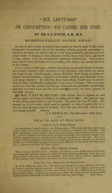 Credit: A friendly letter of counsel and advice to consumptives and other invalids : also, prescriptions, with special directions for the cure of chills and fever / by S.S. Fitch. Source: Wellcome Collection.