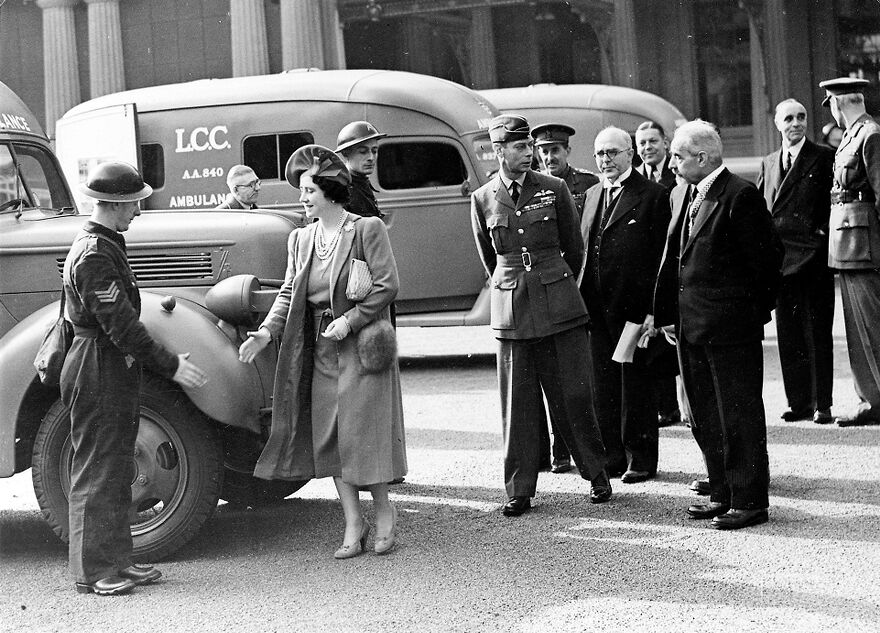 Credit: M0015235: King George VI and Queen Elizabeth with a presentation of ambulances at Buckingham Palace, 1943. Source: Wellcome Collection.