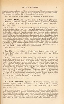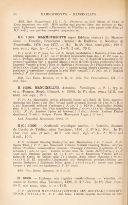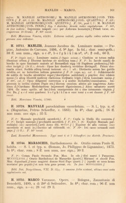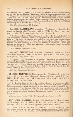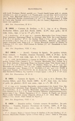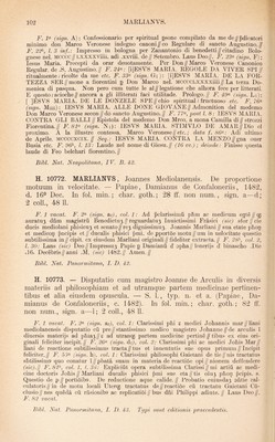 ![F. F (sign. A): Confessionario per spiritual psone compilato da me de//pdicatori minimo don Marco Veronese indegno canoni//co Eegulare di sancto Augustino.// F. 22^, l. 3 inf.: Impresso in bologna per Zanantonio di benedetti // citadino Bolo- gnese nel. MCCCC//Lxxxxviiii. adi .xxviii. de// Setembro. Laus Deo//. F. 23(^ (sign. F); lesus Maria. Precepti da orar deuotamente. Per Don//Marco Veronese Canonico Eegular. de .S. Augustino.// F. 2F: [iJESVS MAETA. EEGOLE DA VIVEE SPI// ritualmente / ricolte da me etc. F. 55« (sign. Gi): [iJESVS MAEIA. DE LA FOE- TEZZA SEE//mone a fiorentini p Don Marco nel. MCCCCLXXXXiiii//La terza Do- menica di pasqua. Non pero cum tutte le al//legatione cbe alhora fece per litterati. E questo / acioche//ancora a gli illiterati faci utilitade. Prologo.// F. 49(^ (sign. Li): [ ]ESVS MAEIA. DE LE DONZELE SPE//chio spiritual / fructuoso etc. F. (sign. Miiii): lESVS MAEIA. xiLLE DONE GIOVANE//Admonition dei medemo Don Marco Veronese secon // do sancto Augustino. // F. 77«, post l. 8: lESVS MAEIA. CONTEA GLI BALLI // Epistola dei medemo Don Mrco. a mona Camilla di // strozzi Fiorentina.// F. 8F (sign. Ni): lESVS MAEIA. STIMVLO DE AMAE//Dio el proximo. A la illustre contessa, Marco Veronese//; data f. 86<^: Adi ultimo de Aprile, mccccxcix.// Seq.: lESVS MAEIA. CONTEA LA MENZO//gna ouer Busia etc. F. 96^, l. 13: Laude nel nome di Giesu.// (16 vv.); deinde: Finisse questa laude di Feo belchari fiorentino.// Bibi. Nat. Neapolitana, IV. B. 42. H. 10772. MAELIANVS, Joannes Mediolanensis. De proportione motuum in velocitate. — Papiae, Damianus de Gonfaloneriis, 1482, d. 16^ Dec. In fol. min.; char. goth.; 28 ff. non num., sign. a—d; 2 coli., 48 11. F. 1 vacat. F. 2« (sign. a^), coi. 1: Ad pclarissimu pbm ac medicum egte//qj auratu3 dnm magistru Benedictu3//reguardatu3 Inuictissimi Frasici (sic) sfor//cie ducis mediolani pliisicu3 et senato//re3 dignissimu3. Joannis Marliani // sua etate pboi^ et medicoi? pncipis et // ducalis phisici pmi. de pportoe motu // iim in uelocitate questio subtilissima in // cipit. ex eiusdem Marliani originali // fideliter extracta. // F. 28^, coi. 2, l. 30: Lans (sic) Deo//Impressu3 Papie p Damianu d’ opba//lonerijs d binascho .Die +16+ Decebris//anni .M. (sic) 14b2.// Arnen.// Bibi. Nat. Panormitana, I. D. 42. H. 10773. — Disputatio cum magistro Joanne de Arculis in diversis materiis ad philosophiam et ad utramque partem medicinae pertinen- tibus et alia eiusdem opuscula. — S. 1., typ. n. et a. (Papiae, Da- mianus de Gonfaloneriis, c. 1482). In fol. min.; char. goth.; 82 ff. non num., sign. a—1; 2 coli., 48 11. F. 1 vacat. F. 2<^ (sign. a2), coi. 1: Clarissimi pbi z medici Johannis mar//liani mediolanensis disputatio cu pre//stantissimo medico magistro Johanne//de arculis i diuersis materijs ad pbia3 // z ad utrancg partem medicine pertine // tibus ex eius ori- ginali feliciter incipit.// F. 26^ (sign. d^), coi. 2: Clarissimi pbi ac medici Jobis Mar// liani de reactione subtilissimus tracta//tus et inuen tutis sue opus primum//Incipit feliciter.// F. 53<^ (sign. h), coi. 1: Clarissimi philosophi Gaietani de tie//nis tractatus sbtilissim9 quo conatur i//pbata suam in materia de reactioe opi//nionem deffendere (sic).II F.8P, coi. 1, I. 36: Expliciut opera subtilissima Clarissi//mi artiu ac medi- cine doctoris Johis//Marliani ducalis phisici pmi sue eta//tis 0103 phoi^ pcipis. s. Questio de p//portioib9. De reductione aqiie calide.// Frobatio cuiusda3 ohtie cal- culatoris // in de motu locali Uterqg tractatus de // reactioe cu tractatu Gaietani Co- clusio//nes queda cu rhsionib9 ac replicatioi//bus dni Philippi adiute.// Laus Deo//. F. 82 vacat. Bibi. Nat. Panormitana, I. 1). 43. Typi sunt editionis praecedentis.](https://iiif.wellcomecollection.org/image/b29006314_0001_0534.jp2/full/800%2C/0/default.jpg)