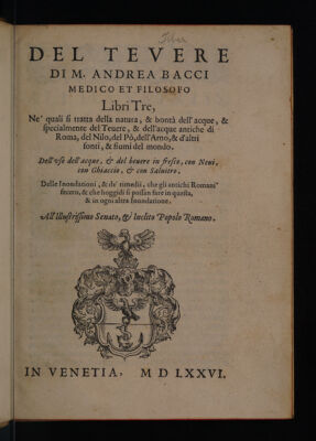 Del Tevere ... libri tre, ne' quali si tratta della natura, et bontà dell'acque, et specialmente del Tevere, et dell'acque antiche di Roma, del Nilo, del Pò, dell' Arno, et d'altri fonti et fiumi del mondo. Dell'usu dell'acque, et del bevere in fresco, con nevi, con ghiaccio, et con salnitro. Delle inondationi, et de' rimedii, che gli antichi Romani fecero, et che hoggidi si possan fare in questa, et in ogni altra inondatione / [Andrea Bacci].