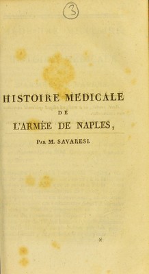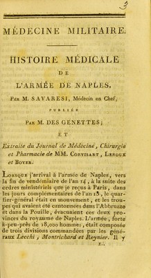 Médecine militaire : histoire médicale de l'armée de Naples / par M. Savaresi ; publiée par M. Des Genettes.