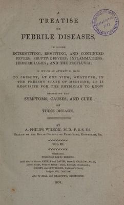 A treatise on febrile diseases. Including intermitting, remitting, and continued fevers ; eruptive fevers, inflammations, hemorrhages, and the profluvia ... / by A. Philip Wilson.