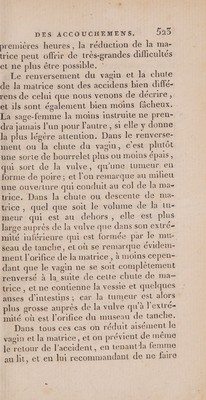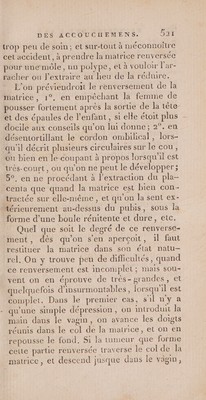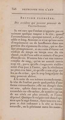 ![RE SECTION PREMIÈRE. Des accidens qui peuvent provenir de l'accouchement. IL est rare que l’enfant n'apporte pas en naissant quelque tumeur à la tête, quand” l'accouchement , quoique naturel, a été pé-- nible et long. Souvent ce n’est qu’une sorte d'empâtement ou de bouffissure dans une poruon des iéoumens du crâne , qui se dis- sipe promptement , si on a soin d’étuver cet endroit de temps en temps avec du vin chaud , ou de l’eau salée et animée d’un peu d’eau-de-vie, D’autres fois c’est une tumeur remplie de sang, qu’on ne sauroit ouvrir trop tôt, parce qu’elle s’augmente visible ment d'un jour à l’autre, que la résolution ne peut s'en faire, et qu'elle a son siége sur | les,os du crâne , que le trop long séjour du | sang pourroit altérer, 1! À la suite de ces mêmes accouchemens, ] la tête de l'enfant paroît quelquefois d’une ! forme extraordinaire ; elle est alongée dans Ml un sens, aplatie dans un autre, et comme recourbée sur elle-même, de manicre qu'un M! de ses côtés est plus arrondi, et l’autre | déprimé. Quoique le vulgaire soit dans l’opi- nion que la sage-femme, dans tous ces cas : peut et doit redonner à la tête sa forme naturelle , en la pétrissant entre les mains,](https://iiif.wellcomecollection.org/image/b33280265_0666.jp2/full/800%2C/0/default.jpg)