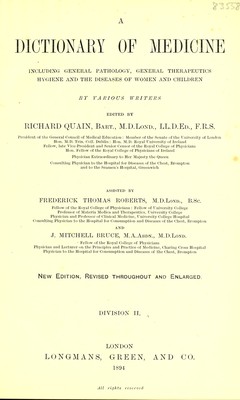 A dictionary of medicine : including general pathology, general therapeutics, hygiene, and the diseases of women and children / by various writers ; edited by Richard Quain ; assisted by Frederick Thomas Roberts and J. Mitchell Bruce.