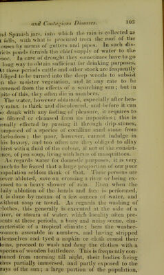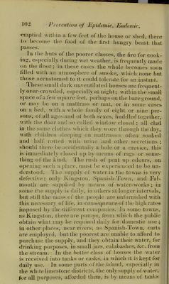 ![le last ei)idemic, a. dung' heap in a yard was no nnsual siij;ht; at present even sonietlmii:; ot tlie same ind niav'^be witnessed. Among- the poorer classes igsties often exist, bnilt immediately below the wni- ow ; poultry and pigeons, and goats, perhaps a po- ev, or an ass or two, complete the small menagerie, overing the unpaved surface with a coat of moist of- ?nsive rilth, extending to the very threshliold. Tiie ays of the sun extricate the moisture, or the rains rom Heaven sweep it bodily away, otherwise it re- lains, with perhaps a brick or two thrown into it, as tepping stones, or an old board laid across it. On tiie out skirts of the town, and in the villages, he fences of yards are often composed of the penguin, Bromelia penguin;) these are objectionable, as they ake up much room, prevent the Iree ventilation of ir, and harbour vermin ; the best fence, most lasting ,nd most economical, for such ])urposes, appears to >e the common stockado. A highly improper prac- ice was formerly very common of interring the dead and remains as yet unprohibitedby law^) in these con- fined yards. V^ery few houses are furnished with water closets, md in these, the sup[)ly of water is often defective. Usually, in the bettei houses, two privies exist, one or tlie family, and the other for the servants ; for the nost part they are under one roof, and built over one :ess-pool or pit; iisually, these privies are crammed nto a corner, off the stables, without any attempt at ventilation. The cess-pools are unpaved at the bot- Lom ; during the seasons or heavy rains, they often ^et full or partially so, and in this way they become, after a time, partially emptied. Rarely is this effected m any other manner. Many of the houses or sheds j( the poor have no such accommodation, in fact, [hey have no out othces at all, except perhaps some- thing in the shape of a kitchen, serviceable, however, only during fine weather. Jn these cases, the calls of nature are performed by them in the open air, or if decency so far forbids, the utensil used, is soon](https://iiif.wellcomecollection.org/image/b21297599_0115.jp2/full/800%2C/0/default.jpg)