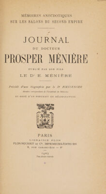 Journal du docteur Prosper Ménière / publié par son fils le Dr. E. Ménière ; précédé d'une biographie par le Dr. Fiessenger ; et orné d'une portrait en heliogravure.