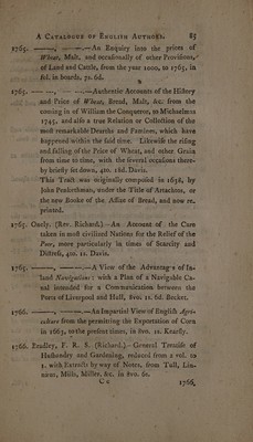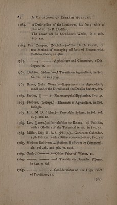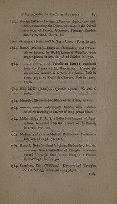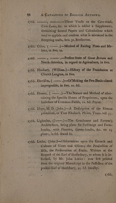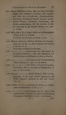 ![1766. ‘Templeman, (Peter.)—-Practical Obfervations on the . Culture.of Lucern, Burnet, tase ara, Fowls- meadow-grals, &c. _ 1966 Whitworth, Efq; (Richard.)—The Advantages of In- _ land Navigations, or fome Obfervations to fhew _ that one may be effeGted between the three Great Ports of Briftol, Liverpool and Hull, &vo. 2s. 6d. Baldwin. 17670 as . Examination of an Fedipatiat View of Englith Agridadian' 8vo. 1s. Wilkie. 1767. ——---, —.—Ananas,a Treatife on the. Pine- Apple, 2s ; 1767. Catefby, F. R. S. (Mark. )} - Hortus Efropx ‘America- nus, or a Collection of 85 Curious Trees and Shrubs ‘the produce of North-America, adapted to Great Britain, Ireland, and moft ‘parts of Europe; Ex- traéted from Catefby’s Carolina. 63 figures on 17 Copper-plates, Imp. Paper, 4to. 2]. 2s. 1757. , .—Sele& Scotch Effa zys, from the Mu- feum Rufticum, tried in Scotland, in 8vo. 6s. 1767. eat ti -—The Praétical Farmer, or Here- tio) fordfhire Hufbandman, in 12mo. 3s. 1767. ——~-~*) ~~~ «A Plan of an Experimental Farm, _ addreffed to Lord Clive, in 8vo. 6s. 1767. ——~---, -—~---.— Uniting and Monopolizing Farms, proved difadvantageous to the Land-Owners, 1s. 6d. Smith. ; | “19767. 4 —~ , ——-.—Obfervations on the Farmers three Letters, to a Member of Parliament, 8vo. 6d. Almon. 1767, Doftie, Efq; (Robert.)—Obferyations on the Pot-Afh brought from America; with the Procefs for making Pot-Ath and Barilla, in North-America, in 8vo. 1767.](https://iiif.wellcomecollection.org/image/b30505914_0432.jp2/full/800%2C/0/default.jpg)