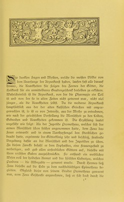 ![iß bunffen Sagen unb 2T(YtE)cn, xvddie bie meiftcn V'ölht von bem Uranfänge ber ^r3netfunft I:ja6en, laufen faft alle barauf Ijtnaus, bie Kranftietten für 5oIgen bes Zornes ber (Sötter, bie fjeilfunft für ein unmittelbares (Snabengefdjenf berfclben 3U erflären. IDaljrfd^einlidi ift bie Strsneüunft, von ber bie pljarmasic ein Ccil ift unb Don ber fie in alten geiten nidjt getrennt toar, nidjt oiel jünger,. als bie KranFIjeiten felbft. Da bie moberne ^r^neifunft Ijauptfäd^Iid? aus ber ber alten ftaffifd^en (5ried^en mit empor= getr>ad|fen ift, fo ift es von 3ntereffe, aus ber Zfiyt^e 3U entnel^men, n?ie nad\ ber gried?ifdjen Dorftellung bie 2Tienfd]Ijeit 5U ben Ceiben, (Sebred^en unb KranfBjeiten gekommen ift. Die firsätjlung lautet ungefälir u?ie folgt: 2tls ber 3apetibe prometf^eus, tneldjer fid7 ber armen 2TÜenfd}i]eit fdion früEjer angenommen Ejatte, bem geus bas 5euer entroanbt unb in einem HartEjefftengel ben 5terblid?en ge= brad|t Ijatte, ergrimmte ber (5ötterfönig fcijr unb befdjIo§, ftrafenbe Vergeltung bafür an ber 2T(enfd]E^eit unb ben 3apetiben 3U üben. §u biefem gtoecfe befahl er bem fjepljaiftos, eine ^rauengeftaU 3U Dcrfertigen, unb gab aüen unfterblid^en (Söttern auf, biefelbe mit il^ren reid^ften (Saben aussufdjmürfen. So entftanb ein meiblid^es IDefen uoll ber Jjolbeften Jlnmut unb bes Ijödiften Ciebrei^es, u^eld^es panbora — bie ^Ubegabte — genannt rciurbe. X>urdi f^ermes lieg* Sens biefelbe auf bie (£rbe 3U bem nad]bebäd]tigen €pimetl]eus be= g(eiten. ©bgleid] biefer oon feinem Bruber prometl^eus gea>arnt roar, Dom ^ens (Sefd^enfe an3unel]men, ließ er fid^ bod^ burdj bie](https://iiif.wellcomecollection.org/image/b21691885_0019.jp2/full/800%2C/0/default.jpg)