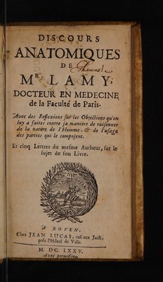 Discours anatomiques. ... Avec des reflexions sur objections qu'on luy a faites contre sa maniere de raisonner de la nature de l'homme, et de l'usage des parties qui le composent. Et cinq lettres du mesme autheur, sur le sujet de son livre / [Guillaume Lamy].