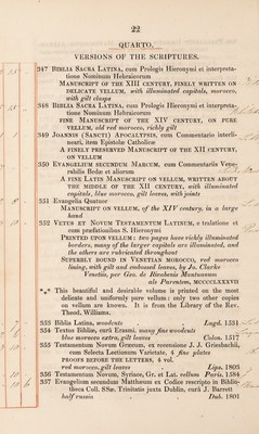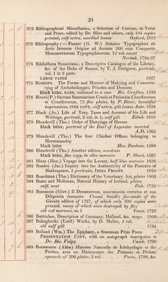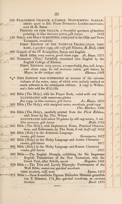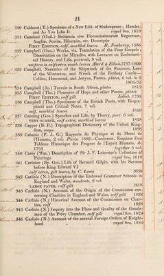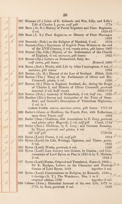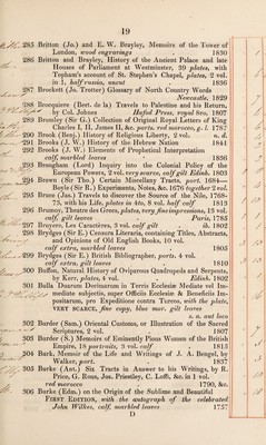 ![^^285 286 287 ^-290 292 293 302 -j> £ 303 306 Britton (Jo.) and E. W. Brayley, Memoirs of the Tower of London, wood engravings . ] 830 Britton and Brayley, History of the Ancient Palace and late Houses of Parliament at Westminster, 39 j.dates, with Topham’s account of St. Stephen’s Chapel, plates, 2 vol. in 3, half russia, uncut . 1836 Brockett (Jo. Trotter) Glossary of North Country Words Newcastle, 1829 Brocquiere (Bert, de la) Travels to Palestine and his Return, by Col. Johnes Hafod Press, royal 8vo, 1807 Bromley (Sir G.) Collection of Original Royal Letters of King Charles I, II, James II, &c .ports, red morocco, g. 1. 1787 Brook (Benj.) History of Religious Liberty, 2 vol. n. d. Brooks (J. W.) History of the Hebrew Nation 1841 Brooks (J. W.) Elements of Prophetical Interpretation calf, marbled leaves • 1836 Brougham (Lord) Inquiry into the Colonial Policy of the European Powers, 2 vol. very scarce, calf gilt Edinb. 1803 Brown (Sir Tho.) Certain Miscellany Tracts, port. 1684— Boyle (Sir R.) Experiments, Notes, &c. 1676 together 2 vol. Bruce (Jas.) Travels to discover the Source of the Nile, 1768- 73, with his Life, plates in 4to, 8 vol. half calf 1813 Brumov, Theatre des Grecs, plates, very fine impressions, 13 vol. calf gilt leaves . Paris, 1785 Bruyere, Les Caracteres, 3 vol. calf gilt . ib. 1802 Brydges (Sir E.) Censura Literaria, containing Titles, Abstracts, and Opinions of Old English Books, 10 vol. calf extra, marbled leaves . 1805 Brydges (Sir E.) British Bibliographer, ports. 4 vol. calf extra, gilt leaves . 1810 Buffon, Natural History of Oviparous Quadrupeds and Serpents, by Kerr, plates, 4 vol. . Edinb. 1802 Bulla Duarum Decimarum in Terris Ecclesiae Mediate vel Im¬ mediate subjectis, super Officiis Ecclesise & Beneficiis Im- positarum, pro Expeditione contra Turcos, with the plate, VERY SCARCE, fine copy, blue mor. gilt leaves s. a. aut loco Burder (Sam.) Oriental Customs, or Illustration of the Sacred Scriptures, 2 vol. . 1807 Burder (S.) Memoirs of Eminently Pious Women of the British Empire, 18 portraits, 3 vol. calf . 1815 Burk, Memoir of the Life and Writings of J. A. Bengel, by Walker, port. . 1837 Burke (Ant.) Six Tracts in Answer to his Writings, by R. Price, G. Rous, Jos. Priestley, C. LofFt, &c. in 1 vol. red morocco . 1790, &c. Burke (Edm.) on the Origin of the Sublime and Beautiful First Edition, with the autograph of the celebrated John Wilkes, calf marbled leaves 1757 D](https://iiif.wellcomecollection.org/image/b29297916_0025.jp2/full/800%2C/0/default.jpg)