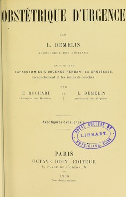 Obstétrique d'urgence / par L. Demelin,... suivie des Laparotomies d'urgence pendant la grossesse, l'accouchement et les suites de couches, par E. Rochard,... et L. Demelin,...