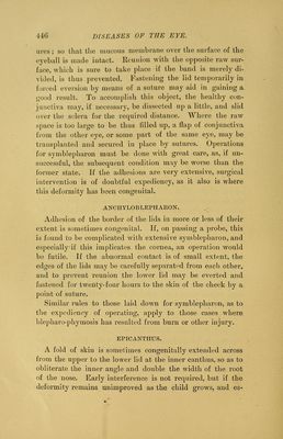 ![Where this occurs in the lower lid the inversion may often be rectified by carefully fastening strips of isinglass or adhe- sive plaster, vertically, to the skin, near the border of the lid, and then, after drawing this downward, securing it upon the skin of the cheek. The same effect may sometimes be obtained by painting the skin of the lid, and its neighbor- hood on the cheek, with collodion, which exerts a contrac- tile action. Should these appliances become detached they must be renewed, and continued for a few days. If in aged people these prove ineffectual, on account of the laxity of the parts, excision of an oval bit of skin, with fibres of the orbicu- laris, and suture of the edges of the wound is a sure relief; or, in lieu of excision, three vertical sutures may be passed through a fold of the skin and tied. The amount of skin to be thus removed or tied may be measured by raising folds of different size with forceps till the proper effect is seen to be obtained. This slight operation is almost painless, and gives great satisfaction. In chronic entropion, resulting from injury, or from con- traction of the tarsal cartilage by trachoma, numerous oper- ations have been recommended, none of them completely satisfactory as being a permanent benefit. An expedient which may suffice in the simpler- cases is cant7io]jlasty, or division of the external commissure of the lids. One blade of strong scissors is passed as far as possible inside the outer canthus, and the skin and conjunctiva are divided at one stroke. The edges of the wound are now to be stretched wide apart without further dissection, and the skin and the mucous membrane are then to be united to each other by three or five sutures in the upper and the lower lids; so as in fact to lengthen each of these, and relax the pressure on the eye. But when the tarsal cartilage is strongly incurvated, it is necessary, if interference is deemed advisable, to devise means by which it shall be bent outward. Snellen, Streatfeild, Wells, and others have proposed meth- ods for longitudinally grooving the anterior surface of the](https://iiif.wellcomecollection.org/image/b21084312_0474.jp2/full/800%2C/0/default.jpg)