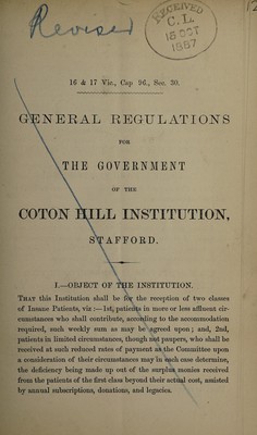 General regulations for the government of the Coton Hill Institution, Stafford / [approved by G.C. Lewis].