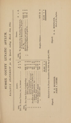 ![: | SUSSEX COUNTY LUNATIC ASYLUM, HAYWARDS HEATH. RiGee TS and EXPENDITURE for the Year ending 31st March, MAINTENANCE ACCOUNT. ee a ee T. ° 1894. RECEIPTS. EXPENDITURE. eS QUARTERS ENDING. Total QUARTERS ENDING. Total : 1893 1s04, (Maren Sloe 1804, | March Slat ? ; March 31st. P Aare. St. : Tune 36th, | Sept. 30th. | Dec. 31st. | acres, June sith, | Sept. 86th.|| Deo. Slat, | s-15™ Stat. ee 7 es. cl pal Se eS. | Goods Sold, viz.:— _ ap es GR RS oct eae Wagege— & 8.6) aoa) Poe a Bie a ww. A: Farm and Garden Sales............... S71) 8. 92-14-10 9 110] 12314 4] 943 29 3 RINOEBD a ealie sain ca wee snahgeeie 563 15 0] 569 0 0} 5731911] 58015 2| 228710 1 Old BUOrES, BO. chs eseccecsescceenes TSS: 6 12 19 10 1410 8 14 4 6/ 53 3 6 Attendants and Others 773 17 5} 84010 4] 80316 9| 822 2 5 | 3240 611 Sundries ........ Reinet necei eu cwsv Mavavaes 67 14 10 6617 6 64.2 9 67 9 1) 266 4 21 Provisions (including Malt Liquor Sums received on Account of the HM-ONdiNg TY Diet) .-scec.cocivcee ss... 1817 3 10 | 2297 1111] 2074 7 3] 1780 6 0| 7969 9 0 - | Maintenance of Pauper Patients :— Malt Liquor, Wine and Spirits (not | From Guardians of Unions and included in ordinary diet)......... 46 11 6 4211 0} 4910 6 51 9 6| 190 2 6 Parishes within the Contribu- Farm and Garden Expenses ........ 330 17 1 | -262 15 1) 54215 8| 500 3 6| 168611 4 tory Counties and Borough ...... 6096 14 2 | 6238 15 8 | 6866 7 8 | 5018 0 11 [o4919 18 5 | Clothing :— From Guardians of other Unions INO RB tLe Mba ser thee secesess sees 235 18 11 | 222 2 4] 30512 9] 26112 9| 1025 6 9 Oe eee 63 0 0] 50 6 0] 2218 9 8 4 Of M48 04. Wor Attendants... 615 9) 10927 Fi 10:4 6 | 110 17) 4 | 287 5 1 From the Treasurers of Contribu- Necessaries (including Fuel, Light- tory Counties and Boroughs ..| 30 1 3] 2319 s| 1914 3| 13 3 8 86 18 10 ing and Washing) .................. 623 17 2) 61812 4/| 109819 4| 890 5 0 | 3231 13 10 From the Treasurers of other Surgery and Dispensary ............... 4017 9 1319 8 17 12 10 2718 6; 100 8 9 Asylums, for Patients received Furniture and Bedding................ 182 210] 473 210) 151 2 3] 112 4 7] 91812 6 under contract or arrangement “ $e a 880 1 4] 880 1 4] Funeral Expenses.......... Saves eel SH alAnG 815 9] 7 14 10 16; 626 6011 1 BEPVAOPALIONES 5.5 .-crsscciecess.ceesces-.| 72 16 0 fo LO! 5157 19-6 52 6 7 | 256 13 10] Payments to Treasurers of other Criminal Patients :— sylums for Patients under | From Parliamentary Vote ........ 17 4 0 1210 0 212 0 nen 32 6 0 contract or arrangement ......... 1473 3 0 | 129419 0 | 2304 2 9 5072 4 9 Funeral and Removal Expenses :— Transfers to the Building and | From Guardians of Unions and Repairs Fund Account, viz. :— Parishes ........... fittacads deveas.tivas ss 224 0 0 15 16 6 29 6 6 2716 6| 9619 6 For Ordinary Repairs (53 Vic., c Other Receipts, specifying them :—| ~ Dieta ML ital): -deeosonan uremseces sss. x Ee | 8917 2) 1815 9| 108 12 11 | Rebate from County Councils ther Payments, specifying them :— under Lunacy Act, 1890, sec. 269 Stationery and | ie ay hays eee 86 0 6 82-10, 8+} 66 2) 7 79) 2 11) Sage = 6 _ (9)—Berry Wood ................ «| 3856 2 0] 304 1 0] 28919 6 950 2 6] Periodicals and Amusements ..... 2716 3| 42 1 7) 201511] 381110] 1299 6 7 Ditto ditto—HastSussex only,ditto eee aise 450 . 45 0 Freight and Carriage ........60........ 77d ed bl oa 64 10518 © |) 154.17 1 | S85 6G Ditto ditto—Littlemore ...... ........ 12 3 9 x = tees OF acid en bale ...1...s<0ciais sweeten cassie... 40 611); 161110) 27 2 0] 2% 6 2) 107 511 Ditto ditto—Fisherton House ...... aoe ee 256 7 6 256 7 6 aid to West Sussex Council - Ditto ditto—Grove Hall............... Gc 1S SS 3 2b. 12 4312 5 under Article 5 of the Order of the L. G. Act Commissioners of the 12th April, 1892 ....... ueehys: ee ee = 171719 1 | 17 as i Total Receipts ........0.....666 6838 15 9 | 6840 4 0| 7662 6 4 | 6205 011 27546 7 O Total Expenditure ..........., 6291 0 0 | 694416 5 | 82491411] 7187 6 5 28672 17 9 | Balance at the Commencement of Balance in hand at End of Year, | the Year, viz. :— Bde eee 560 oer 6200 5 1 Viz. :— = ee 50738 14 4 ‘Total of Receipts and Balances......| sis 08 vee 3 83746 12 1] Total of Expenditure and Balances zi 33746 12 1 q A 4 { | BUILDING AND REPAIRS FUND ACCOUNT. | i | QUARTERS ENDING. QUARTERS ENDING. Total 9 EXPENDITURE. year ending June 30th. | Sept. 30th. | Dec. 31st. | March 3ist,| March 31st. June 30th. | Sept. 80th. | Dec. 31st. | March sist.) March 3ist. oss Oe ed.) £ aod), 2) 8. a 8 da) £8, dil \e s dl 2 pom Sone COCO 3386 7 4] 33717 8] 30319 0| 37814 6 (1446 18 6] Ordinary Repairs... sooreceesceeresene| S44 7 6 | 34410 8] 48917 8 | 404 0 3 | 1582 16 1 | Additio: ions, and Im j ee ee ee See ee ¥ 1616 0| 120 0 0 r 20. sOalo. Re: i 2 = | ie = —— 226 4 7] 18411 10 = 385 19 5 ye eepers 226 4 7| 18411 10 385 19 5| 796 15 10 = is i 103 2 8| 103 2 3] Rates, Taxes, and Insurance m ‘a 103 2 3| 103 2 3 22110 3| 22110 3| 252 011 13 ) 695 1 5 | 22110 3] 22110 3 695 1 5 80 21 613 0 16| 610 0| 27 48 | ~ ¢. 8, Sec. 27 pee | a 8917 2) 1816 9 | 933 6 4| 767 8 9| 86118 7| 95012 8 MUN seria sae es bs ee ee mmittee, April 28th, 1894. as (Signed) Pee ——- , ees S. A. MORTLOCK, Se =e = * aw . the tee Sor each Patient, from Weekly Rate. | as 2 : ri —. ! AVERAGE Weexiy Ex EXPENDITURE for } ___ QUARTERS ENDING, — ‘| Sept. 30th. | Dec. 3ist. ee eee](https://iiif.wellcomecollection.org/image/b31850388_0013.jp2/full/800%2C/0/default.jpg)