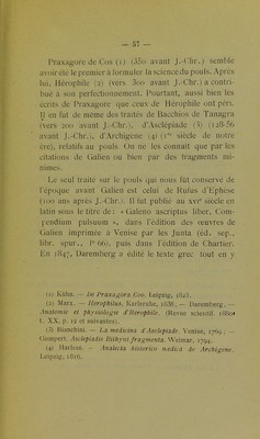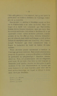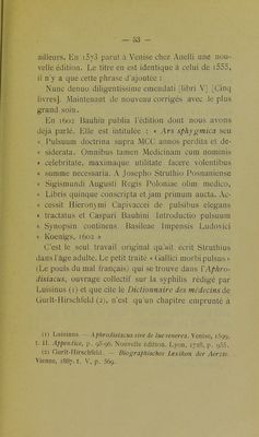 ![ailleurs. LCn i5~3 parut à Venise chez Anelli une nou- velle édition. Le titre en est identique à celui de 1555, il n'y a que cette phrase d’ajoutéc : Nunc denuo diligentissime emendali [libri V] [Cinq livres]. Maintenant de nouveau corrigés avec le plus grand soin. En 1602 Bauhin publia l'édition dont nous avons déjà parlé. Elle est intitulée : « Ars sphygmica seu « Pulsuum doctrina supra MCC annos perdita et de- « siderata. Omnibus ta ni en Medicinam cum nominis « celebritate, maximaque utilitate facere volentibus « summe necessaria. A Josepho Struthio Posnaniense « Sigismundi Augusti Regis Poloniae olim medico, « Libris quinque conscripta et jam primum aucta. Ac- « eessit Hieronymi Capivaccei de pulsibus elegans « tractatus et Caspari Bauhini Introductio pulsuum « Synopsin continens. Basileae Impensis Ludovici « Koenigs, 1602 » C’est le seul travail original qu’ait écrit Struthius dans l'âge adulte. Le petit traité « Gallici morbi pulsus» (Le pouls du mal français) qui se trouve dans YAphro- disiacus, ouvrage collectif sur la syphilis rédigé par Luisinus (1) et que cite le Dictionnaire des médecins de Gurlt-Hirschfeld (2), n'est qu'un chapitre emprunté à (1) Luisinus. —Ap/irodisiacus sive de lue venerea. Venise, 1599, t. II. Appendice, p. 9.5-96. Nouvelle édition. Lyon, 1728, p. ç55. (2) Gurlt-Hirschleld. — Biographisches Lexikon der Aerzte. Vienne, 1887. t. V, p. 56g.](https://iiif.wellcomecollection.org/image/b28034430_0061.jp2/full/800%2C/0/default.jpg)
