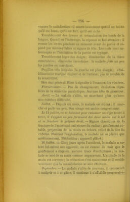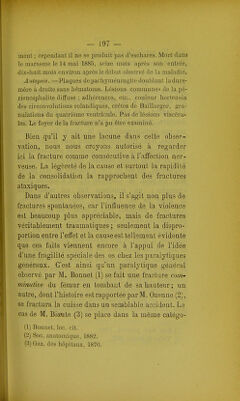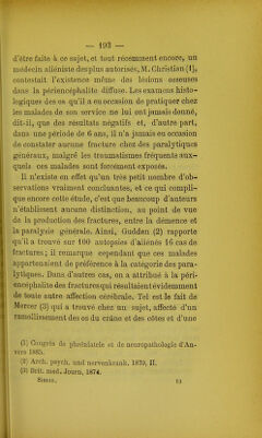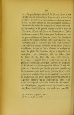 ![rie : Un paralytique général de 50 ans s'était frac- turé le bras en tombant sur l'épaule, à la suite d'un .fauxpas. A l'autopsie, on constata une fracture com- plexe, oblique depuis le col chirurgical jusqu'au- dessous de la moitié du corps ; des fissures nombreu- ses existaient à la partie supérieure de la tête de l'humérus ; l'os avait éclaté en divers points. Cette fracture, comme le fait remarquer l'auteur, ne ren- tre pas certainement dans la classe des fractures banales. Nous rappellerons enQ.n pour montrer que véritablement la paralysie générale peut entraîner à sa suite des lésions osseuses, entre autres troubles trophiques, les cas où l'on a observé un mal perfo- rant du pied. M. Christian (1) en a signalé deux exemples ; un troisième fait est relaté dans la thèse de M. Lian (2), mais cette observa- tion laisse vraiment trop à désirer au sujet de la précision des détails, bien que l'autopsie ait confirmé le diagnostic de périencéphalite diffuse. Il est im- possible, d'après le peu défaits que nous possédons, de déterminer quels sont les os qui sont le plus fré- quemment atteints. D'après les Anglais, ce seraient de préférence les côtes, mais nous avons dit déjà à plusieurs reprises qu'ils confondaient dans une même description toutes les formes de l'aliénation mentale. Ce point appelle donc de nouvelles recher- ches. La consolidation est non seulement possible, (1) Ann. med. psychol., 1882. (2) Thèse de Paris, ]885.](https://iiif.wellcomecollection.org/image/b22293735_0206.jp2/full/800%2C/0/default.jpg)