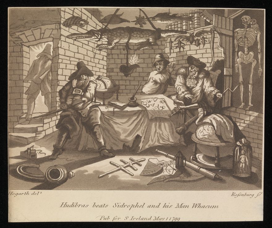 Credit: In a chamber containing stuffed animals, a globe and astrological devices Hudibras, about to draw his sword, startles Sidrophel and Whacum. Aquatint by C. Rosenberg, 1799, after William Hogarth. Source: Wellcome Collection.