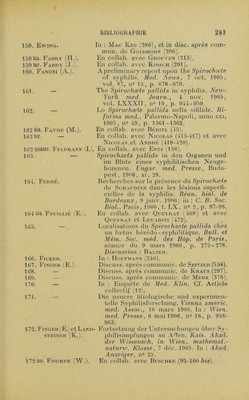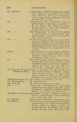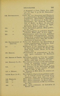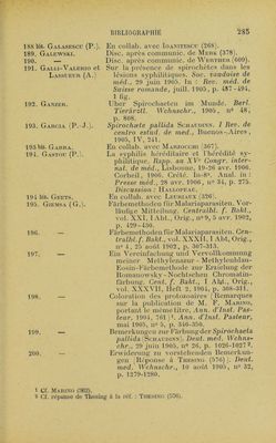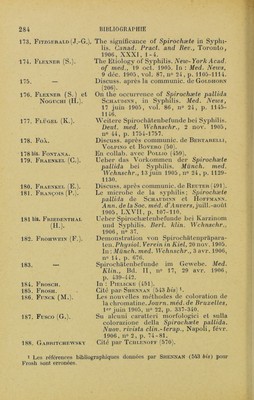 ![201. Gierke (E.). 202. 202 bis. Girard. 203. Gi.as (E.). 204. — 204 bis. — 205. Goi.diiorn (L.-B.). 206. [Présentation de spirochètes sur des coupes d’organes d’enfant hérédo-syphilitique.j VereinFreiburger Aerzte, 19 janv. 1906. Réf. de Gierke (202). Das Verhaltniss zwischen Spirochaeten und den Organen kongenital syphili- tischer Kinder. Münch. med. Wchn- sclir., 27 févr. 1906, n° 9, p. 393-396. En collab. avec Veillon (591). Démonstration der Spirochæte pallida aus einer Zahnfïeischsklerose. Wien. laryng. Gesell., 8 nov. 1905. In : Wien. kl. Wchnschr., 11 janv. 1906, n° 2, p. 56. [Tonsilarsklerose. Differentialdiagnose ge- genüber Angina ulcéra membranacea Vincenti ] Wien. laryng. Gesell sch., 7 févr. 1906. In : Wien. kl in. Wchn- schr., 15 mars 1906, n° 11, p. 322. Ucber Spirochæte pallida. Inaug.-Diss., Leipzig, 1906. [Méthode simple pour la recherche bacté- riologique du Spirochæte pallida de la syphilis.] Post-Graduai, févr. 1906. Anal, in : Gaz. des Iîôp., 1906, p. 477. Patholog. Soc. of New - York, 1906. Réf. de Mac Kee (286). Discussion : Eyving, Fi.exner. 207. Gonder. 208. Gordon. 208 bis. Gossner. 209. Greeff. 209 bis. Greeff et Ci.au- SEN. 210. Gregoropoudos (G.). 211. Grôn (K.). 211 bis. Grimbert (L.). 212. Grouven (C.). 212 bis. — In: Schaudinn et Hoffmann (528 et 530). Contribution to the stud}^ of syphilitic spirochætas in cerebrospinal fluid. Amer, med., Philadelphie, 22 juill. 1905, vol. X, n° 4, p. 155. Spirochæte pallida. Deul. militarârztl. Zeitschr., 1906, Heft 5. Discuss. après la comm. de Kowalewski (295). [Spirochæte pallida dans la kératite expé- rimentale.) Deul. med. Wchnschr., 6 sept. 1906, n° 36. Hep'i lou gtzpoëioa xaucptXiàor. ’laxpix^ TtpooSo;, ’Ev 2ép(û , 1905, x, 265-267. Den Schaudinn-Hoffmannske syfdispro- tozoe [Spirochæte pallida Schaudinn). Tidsskrifl for den norske laegefore- ning, 1905, n° 12, p. 419. En collab avec Guiart (215). Disc, après communie, de Merk (378). En collab. avec Doutrelepont (136, 137).](https://iiif.wellcomecollection.org/image/b28120814_0300.jp2/full/800%2C/0/default.jpg)