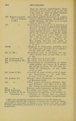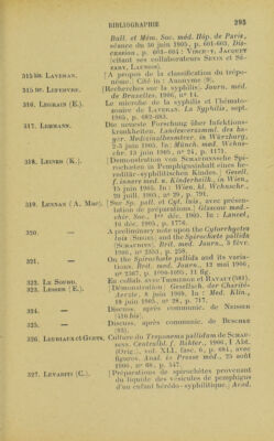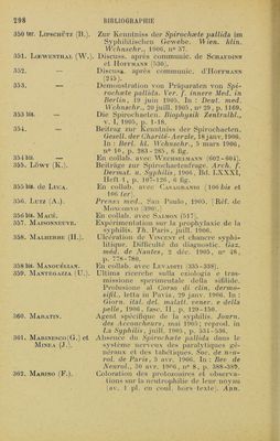 ![350 ter. Lipschütz (B.). 351. Loewenthal (W. 352. 353. — 353 bis. — 354. — 354 bis. — 355. Lowy (K.). 355 bis. de Luca. 356. Lutz (A.). 356 bis. Macé. 357. Maisonneuve. 358. Malherue (H.). 358 bis. Manouélian. 359. Mantegazza (U.). 360. Mahatin. 361. Marinesco(G.) et Mine a (J.). Zur Kenntniss der Spirochæte pallida im Syphilitisohen Gewebe. W ien. klin. Wchnschr., 1906, n° 37. ). Discuss. après communie, de Schaudinn et Hoffmann (530). Discuss. après communie. d’HoFFMANN (245). Démonstration von Prâparaten von Spi- rochæte pallida. Ver. /'. innere Med. in Berlin, 19 juin 1905. In : Deul. med. Wchnschr., 20 juill. 1905, n° 29, p. 1169. Die Spirochaeten. Biophysik Zentralbl., v. I, 1905, p. 1-18. Beitrag zur Kenntniss der Spirochaeten. Gesell. der Charité-Aerzle, 18janv. 1906. In : Berl. kl. Wchnschr., 5 mars 1906, n° 10, p. 283- 285, 6 fig. En collab. avec Wechselmann (602-604). Beilrage zur Spirochaetenf'rage. Arch. /'. Dermat. u. Syphilis, 1906, Bd. LXXXI, Ileft 1 , p. 107-126, 6 fig. En collab. avec Casagrandi (106 bis et 106 1er). Prensa med., San Paulo, 1905. [Réf. de Moncorvo (390).] En collab. avec Salmox (517). Expérimentation sur la prophylaxie de la syphilis. Th. Paris, juill. 1906. Ulcération de Vincent et chancre syphi- litique. Difficulté du diagnostic. Gaz. méd. de Nantes, 2 déc. 1905, n° 48, p. 778-780. En collab. avec Levauiti (335-338). Ultima ricerchc sulla eziologia e tras- missione sperimentale délia sifilidc. Prolusione al Corso di clin, dermo- si/il., letta in Pavia, 29 janv. 1906. In : Giorn. ilal. del. malatl. vener. e délia pelle, 1906, fasc. II. p. 129-150. Agent spécifique de la syphilis. Journ. des Accoucheurs, mai 1905; reprod. in La Syphilis, juill. 1905, p. 534-536. Absence du Spirochæte pallida dans le système nerveux des paralytiques gé- néraux et des tabétiques. Soc. de neu- rol. de Paris, 5 avr. 1906. In : Rev de Neurol., 30 avr. 1906, n0 8, p. 388-389. Coloration des protozoaires et observa- tions sur la neutrophilie de leur noyau (av. 1 pl. en coul. hors-texte). Aim. 362, Marino (F.).](https://iiif.wellcomecollection.org/image/b28120814_0312.jp2/full/800%2C/0/default.jpg)