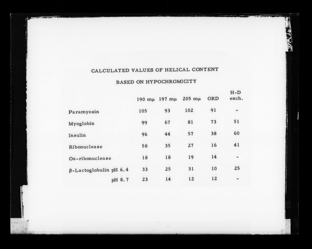 Credit: Table referenced as "For UV [ultraviolet] spectra of proteins. Helix contents compared with ORD [optical rotary dispersion] and H-D [hydrogen-deuterium] exchange". Source: Wellcome Collection.