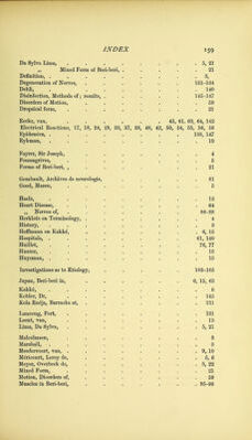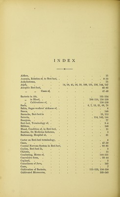 ![INDEX Aitken, Anaemia, Relation of, to Beri-beri, Ankylostoma, At] eh, Atrophic Beri-beri, ,, ,, Cases of, Bacteria in Air, „ in Blood, . ,, Cultivations of, Baelz, Baliia, Sugar-workers' sickness of, Banca, Barracks, Beri-beri in Batavia, Beaujean, Beri-beri, Terminology of, . Billiton, Blood, Condition of, in Beri-beri, Bontius, De Medieina Indorum, Buitenzorg, Hospital at, Carter on Beri-beri terminology, Cases, Central Nervous System in Beri-beri, Ceylon, Beri-beri in, Christie, Combating, Means of, Convulsive form, Copland, Cornelissen of Java, Corre, Cultivation of Bacteria, Cultivated Microcccus, 14, 19, 45, 56 109, 131 6, 7 136, 15 . 9-13 75 144, 147 45-65 47-49 131-134 106-110, 116-130 116-130 13, 21, 68, 78 6 . 140 15, 112 114, 142, 144 77 3-4 140 11 3 61 4 47-59 92-95 3 15 144-151 33-44 5 145 7 111-115, 116-130 135-143](https://iiif.wellcomecollection.org/image/b21364515_0178.jp2/full/800%2C/0/default.jpg)