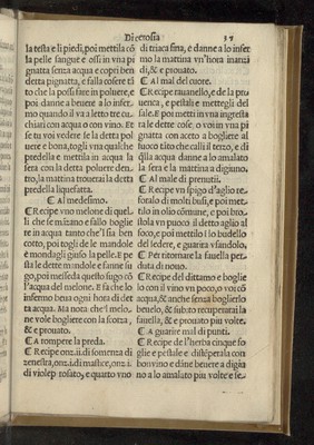 Credit: Recettario di Galeno ottimo e probato a tutte le infirmitadi che accadeno a gli huomini et a le donne di dentro e di fuori li corpi. Con remedio di conservar la sanita e prolongar la vita, e con molte altre cose che nelli altri prima stampati non erano, et con molte belle altre recette contra la peste / Tradotto in volgare per ... Zoane Saracino. Source: Wellcome Collection.