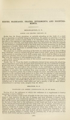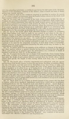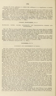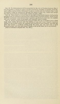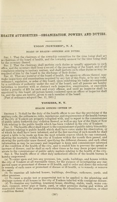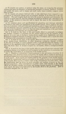 ![(e) To require any person, or persons using the same, or occupying the premises whereon the same are situated, or owning said premises, to cleanse, disinfect, ventilate and purify the same, and to empty any such vault, water conduit, cesspool, sewer pipe or basin. (/) To require all persons infected with, or who shall have been exposed to any contagious or infectious disease and not properly isolated, to be removed to the city hospital. The said hospital shall also have the power to ascertain and determine the expense of such removal, and the expense incurred for medical care, attendance and support of the persons so removed, and to report the same to the commissioner of public safety. (g) To examine plans and specifications for plumbing and drainage submitted according to the rules and regulations of the health bureau, and to approve the same when in conformity with such rules and regulations, also to inspect the work of plumb- ing and drainage upon any premises in the city of Yonkers while the same is in prog- ress and at its completion, and to see that the rules and regulations of the said bureau as to plumbing and drainage are complied with. Sec. 4. It shall be the duty of the said health officer to personally investigate the sanitary condition of premises and the means employed for the isolation of the patient, in every case of smallpox, typhus fever, scarlet fever, diphtheria, and other dangerous contagious diseases occurring in the city of Yonkers, and to report the same in writing to the commissioner of public safety. Sec. 5. It shall be the duty of the health officer in every case of smallpox, typhus fever, scarlet fever, diphtheria, or other dangerous contagious diseases occurring in the city of Yonkers, to cause a printed notice or placard denoting the disease, to be placed on the apartment door of all houses occupied by more than one family, and upon the front door of houses occupied by one family, where a contagious disease exists. Sec. 6. It shall be the duty of the health officer to cause all premises infected with contagious disease to be disinfected and fumigated at the expiration of quarantine, by, or under the supervision of, an inspector of the health bureau. Sec. 7. Whenever a physician’s report, pursuant to the provisions of section 12 of this sanitary code, shall have been received by the health officer, it shall be his duty to record and register in a book suitable for the purpose all of the facts and information stated in such report. Such report and register shall be the property of the health bureau, and shall be confidential, and not accessible to the public except on recommendation of the health officer and by a written order of the commissioner of public safety, when the information may be given for such scientific and sanitary purposes as may be deemed important. The commissioner of public safety shall furnish to the health officer all necessary blanks, envelopes, and postage stamps required for making such such report, the same to be delivered by the health officer to the physician. [Part of ordinance adopted Dec. 26, 1911.] /](https://iiif.wellcomecollection.org/image/b28717569_0210.jp2/full/800%2C/0/default.jpg)