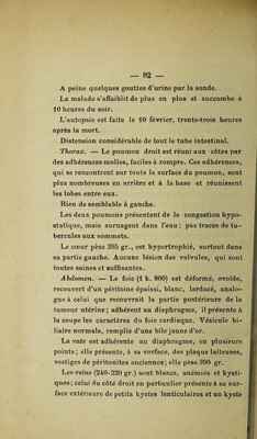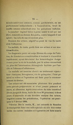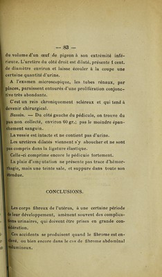 ![Du côté de la vessie, ik se manifestent par l’inconti¬ nence, plus souvent la rétention de l’urine, parfois 1 u sure de la paroi et la formation d’une fistule. Sur le rein et l’uretère, ils agissent à la manière d’un< ligature qui serait progressivement resserée. L’uretère est dilaté (hydronéphrose), le rein est enflammé (sclé¬ rose, suppuration). Ces complications rénales ont une influence trè; grande sur la marche de la maladie ; la mort est souven; la conséquence de la moindre opération. Elles doivent toujours être soupçonnées par le chirurj, gien et l’inviter, si la malade n’est point trop affaibli* à hâter l’opération. Dans le cas contraire, à préférer l’intervention chirurgicale un traitement médical a] proprié. Vu Bon à imprimer, Le Président de la thèse, DAMASGtlINO. Vu et permis d’imprimer, Le Vice-Recteur de l’Académie de Parij GRÉARD.](https://iiif.wellcomecollection.org/image/b30579594_0084.jp2/full/800%2C/0/default.jpg)