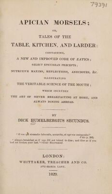 Apician morsels; or, tales of the table, kitchen, and larder. Containg a new and improved code of eatics; select epicurean precepts; nutritive maxims, reflections, anecdotes, &c. ... / By Dick Humelbergius Secundus.