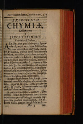 Chymia philosophica perfecte delineata, docte enucleata & feliciter demonstrata à multis hactenus desiderata nunc vero omnibus philatris consecrata cum brevi sed accurata et fundamentali salium doctrina. Medicamentis etiam sine igne culinari facile parabilibus, necnon exercitio chymiae appendicis loco locupletata / Jacobo Barnero ; cum indice rerum consummatissimo.