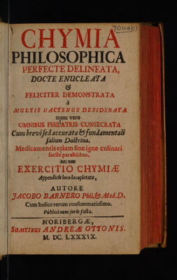Chymia philosophica perfecte delineata, docte enucleata & feliciter demonstrata à multis hactenus desiderata nunc vero omnibus philatris consecrata cum brevi sed accurata et fundamentali salium doctrina. Medicamentis etiam sine igne culinari facile parabilibus, necnon exercitio chymiae appendicis loco locupletata / Jacobo Barnero ; cum indice rerum consummatissimo.