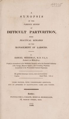A synopsis of the various kinds of difficult parturition, with practical remarks on the management of labours / By Samuel Merriman.