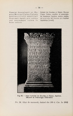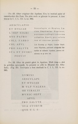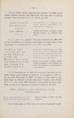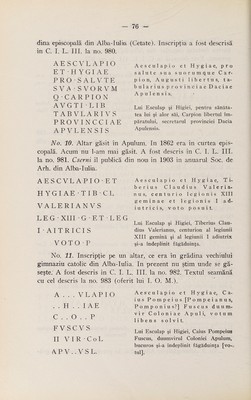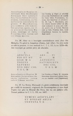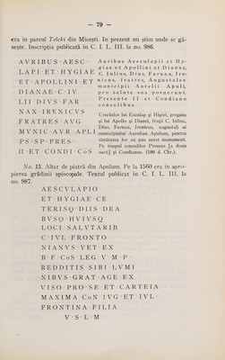 ![Aesculapio et Hygiae ce- terisque d i i s deabusque huiusque loci salutari- bus, Caius Iulius Front o- nianus, veteranus, ex be- neficiario cons u laris le¬ gion i s V Macedonicae, pro redditis sibi lumini- bus gratias agens, ex v i- so pro se et Carteia Ma¬ xima, coniuge et Iulia Frontina filia votum sol¬ vit libens merit o. Lui Esculap §i Higiei §i celorlalp zei §i zei^e binefacatoare ale acestui loc Caius Iulius Frontonianus, ve¬ teran, fost beneficiar al consularu- lui, din Leg, V. Macedonica, pen- tru redarea luminii ochilor sai adu- cand mulpmiiri in urma unei vede- nii, pentru sine §i Carteia Maxima sope §i Iulia Frontina fiica, votui [fagaduupa] bucuros 1-a implinit, dupa merit. No. 16. Altar cu o inscripifie asemanatoare unui altar din Mehadia. S’a gasit la Ampelum (Zlatna, juid. Alba). Nu stim unde se afla in prezent. A fost studiata in C. I. L. Ill, la no. 1279—80. Are inscripfii pe ambele parfi ale altarului. I. AESCVLA PIO • ET * H Y GI AE • M • A • TONI VS SATVRNI N VS • DEC • COL V • S • L • M • Aesculapio et Hygiae, M. Antonius Saturninus de¬ curio coloniae, votum solvit libens merit o. II. AES .... PI O.. . M ANTONIVS SATVRNINVS DEC - COL V • S • L • M • Lui Esculap §i Higiei, M. Antonius Saturninus decurionul coloniei bucu¬ ros §i-a implinit votui [fagaduhpa]. No. 17. La Bretea Mure^ana s’a gasiit urmatoarea inscripfie pe o tabla de marmora, originara din Sarmizegetusa si care dupa Teglas s’ar gasi in Muzeul din Deva, dar uu am putut-o afla. Textul publicat in C. I. L. Ill, no. 1417. NVMINI • AESCVLAPI ET • H YGIAE* AELI A VENVSTA V - S •](https://iiif.wellcomecollection.org/image/b30630162_0084.jp2/full/800%2C/0/default.jpg)