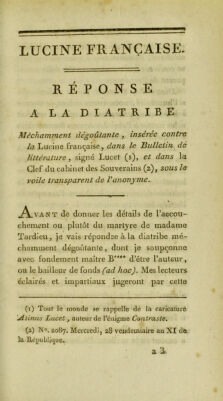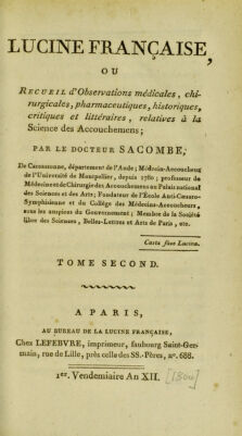 Lucine française, ou recueil d'observations médicales, chirurgicales, pharmaceutiques, historiques, critiques et littéraires, relatives à la science des accouchemens / [Jean François Sacombe].