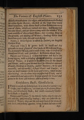 ![37> tigheiet. % nema | be Vertues of Englifh Plaats. 127 een ie | Se ey ROE Te 3 e . . ° ° i] Wt Inj e\helps concottion, expells winde from it, being boiled in Wine iia and taken morning and evening it helps a moift brain andthe Till Vent eg 0 trembling of the Heart, and knawings of the Sto- by thecyimoach ;. tb clean ifes the p afjages of the Urine, provokes Venery, Water vi helps conception » and remedies cold and windy diftempers of he Niyithe Womb , being drunk with the water or juyce of Plantatu ; tthe i ‘it flops the bloody Flax and firengthens nature; helps the trem- and bling of the Heart, and comforts the brains balf a dram of wil kei the powder thereof is the dofe at onetime , to betaken in the ef Dufgh) Morning » or am hour before meat. f | h 1 ’ $ ® ADAG) Inanelh Garlick. Allium. 1 Nep, andl - hi , ie you finell ones breath that hath eaten ic,you may know it by the fcent. Names.| Alliam the Latines callit, and Gallen Theriaca 6; Atl ith | Rufticorum, Countreymans Treacle, in Englifh Garlick. ip, |. Ieis:plantedin {mall cloves in Gardens, which grow to ny ig} Great heads by the latter end of Sammer. ‘| > Nature and Vertues. | Jt is bot and dry in the fourth de- Hy bien | S7%> Martial Plant, it beats the body being eaten, digefting nif of | 4704 Confuming tough and clammy humours, opens obfiructionss vin remedies cold poifans, ant the bitings of venomous Beajts ; i | helps old Coughs, provokes Urine, kills Worms,breaks Winde, helps the Chollick and Dropfie, proceeding of cold ; it flirs up natural heat, and helps a cold and moift Stomach , +t % good againft the biting of mad Dogs, for fhortnefs of breath, the cold Head-ache , Confumption of the Lungs, and pising of Blood, being tempered with Honey ; and the parts anointed: . with it, cures (cabbed Heads, Scurff, Morphew and Tetters : | the Afhes firewed in Ulcers heals them , being applycd with 1 ft Figs and Commyn, it cures the biting of a Shrew-Moufe. NC Vices. Many avethe Vertues of Garlick, yet accompar 4 i | nied with fome Vices , it is hureful for young. men and chol- I ial derick, perfons,y for woinen with Childe, and {uch as give fucks DAS ang ft i | cbf of md | vanfestle. |](https://iiif.wellcomecollection.org/image/b30325730_0151.jp2/full/800%2C/0/default.jpg)