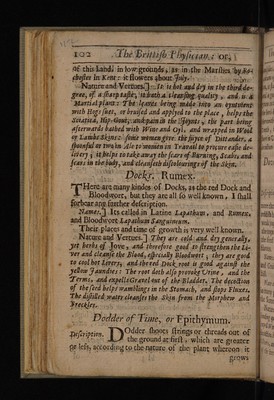 Botanologia. The Brittish physician, or, The nature and vertues of English plants. Exactly describing such plants as grow naturally in our land, with their ... applications and vertues, physical and astrological uses, treated of, each plant appropriated to the several diseases they cure ... / [Robert Turner].