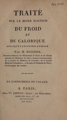 Traité sur le mode d'action du froid et du calorique appliqué à l'économie animale / [D. L. Rozière].