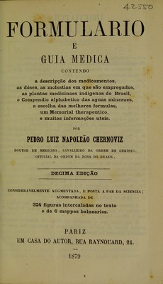 Formulario e guia medica : contendo a descripção dos medicamentos, as dóses, as molestias em que são empregados, as plantas medicinaes indigenas do Brasil, o compendio alphabetico das aguas mineraes, a escolha das melhores formulas, um memorial therapeutico, e muitas informações uteis / por Pedro Luiz Napoleão Chernoviz.