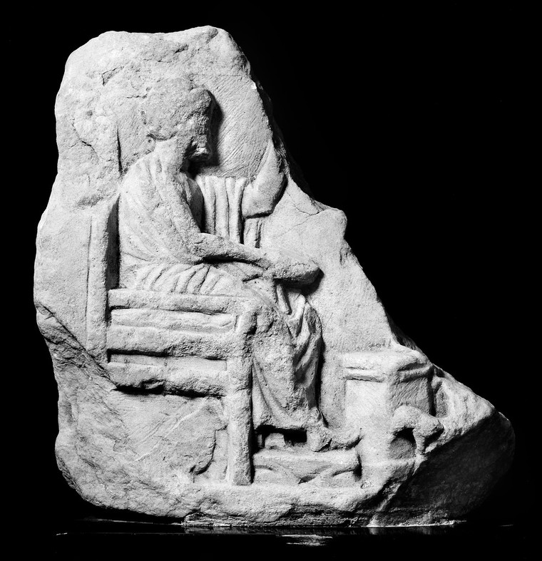 M0015213: Fragment of a votive offering plaque carved in relief showing Asclepius, c.2nd century A.D. Attribution 4.0 International (CC BY 4.0). Source: Wellcome Collection.
