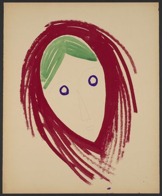Credit: Face with green fringe and blue eyes on a red ground. Source: Wellcome Collection.