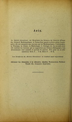 ![Avis] ) ■/ , - : Le ^Bulletin /nternationah de l’académie des Sciences de Cracovie (Classe des Sciences Mathématiques et Naturelles) paraît en deux séries: la pre- mière (A) est consacrée aux travaux.sur les Mathématiques, l’Astronomie, la Physique, la Chimie, la Minéralogie, la Géologie etc. La seconde série (B) contient les travaux qui se rapportent aux Sciences Biologiques. Les abonnements sont annuefs et partent de janvier. Prix pour un an (dix ' numéros): Série A ... 8 K; Série B... 10 K. Les livraisons du ^Bulletin Internationah se vendent aussi séparément. Adresser les demandes à la Librairie «Spdlka Wydawnicza Polska» , Rynek GL, Cracovie (Autriche).](https://iiif.wellcomecollection.org/image/b22472654_0020.jp2/full/800%2C/0/default.jpg)