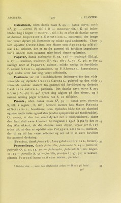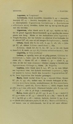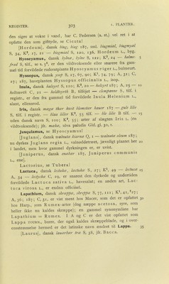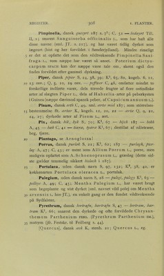 ![Pimpinella, dansk quesyrt 187 s. 71; C, 51 —bedæyrt Till. II, 1; snarest Sanguisorba officinalis L., som har haft alle disse navne (sml. JT. s. 217), og har været tidlig dyrket som lægeurt (hist og her forvildet i Sønderjylland). Mindre rimeligt 5 er det at opfatte det som den vildtvoksende Pimpinella Saxi- fraga L., som næppe har været så anset. Poterium diety o - carpum spach kan der næppe være tale om, skønt også den findes forvildet efter gammel dyrkning. Piper, dansk pipær S, 24, 38, 39: K1, 65, 80, kogeb. 6, 12, 10 13 osv.; Q, 5, 10, 19 osv. —peffwer C, 48, omfatter mindst to forskellige indførte varer, dels torrede frugter af flere ostindiske arter af slægten Pi per l., dels af Habzelia-arter på peberkysten i Guinea (næppe dærimod spansk peber, afCapsicumannuum l.). Pisum, dansk erth C, 49, sml. ærtæ miel 187; som storrelses- 15 bestemmelse flt. ærtær K, kogeb. 11, 20, 22 — ærtæ Q, 9, 21, 24, 27; dyrkede arter af Pisum L., ært. Pix, dansk bik, byk S, 70; K1, 67 — bijch 187 — bekh A, 45 — bæk C, 41 — tiæræ, tyæræ K1, 67; destillat af nåletræer, beg, tjære. 20 Plantago, se Arnoglossa! Porrus, dansk purløk S, 21; K1, 62; 187 —purløgh, pwr- løg A, 47; C, 43; er ment som Allium Porrum l., porre, men muligvis opfattet som A. Schoenoprasum l., græsløg (dette sid- ste gælder temmelig sikkert bisløch i 187). 25 Portulaca, uden dansk navn S, 97, 132; K2, 38, 40, er køkkenurten Portulaca oleracea L., portulak. Pulegium, uden dansk navn S, 28 —pulegi, pulegy K1, 63 — polleye A, 49; C, 45; Mentha Pulegium l., har været brugt som lægeplante og vist dyrket (sml. navnet vild polej om Mentha 30 arvensis L. hos JT.), en enkelt gang er den fundet vildtvoksende på Sydfalster. Pyrethrum, dansk bertrafn, bærtrafn S, 47 — bertram, bær- trarn K1, 66; snarest den dyrkede og ofte forvildede Ch rysan- themum Parthenium pers. (Pyrethrum Parthenium sm.), 35 matrem (jfr. Festskr. til Feilberg s. 44). [Quercus], dansk æek K, stenb. 21; Quercus L., eg.](https://iiif.wellcomecollection.org/image/b24867482_0426.jp2/full/800%2C/0/default.jpg)