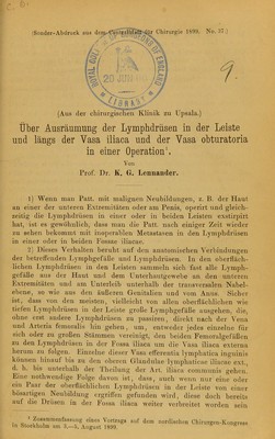 Über Ausräumung der Lymphdrüsen in der Leiste und längs der Vasa iliaca und der Vasa obturatoria in einer Operation / von K.G. Lennander.