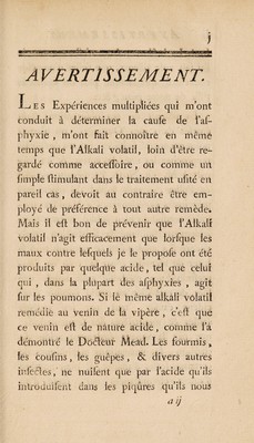 Expériences propres à faire connoître que l'alkali volatil-fluor est le remède le plus efficace dans les asphyxies / avec des remarques sur les effets avantageux qu'il produit dans la morsure de la vipère, dans la rage, la brûlure, l'apoplexie, &c. Par M. Sage.