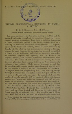 Epidemic cerebro-spinal meningitis in Paris : a review / by J.D. Rolleston.