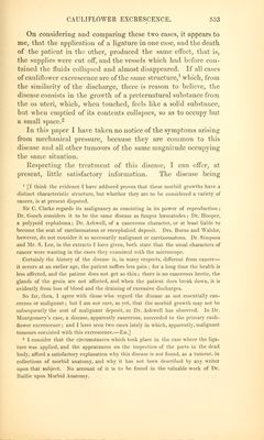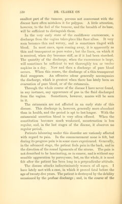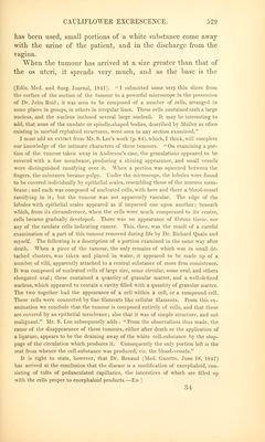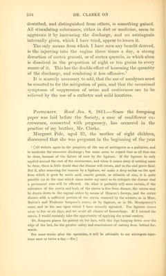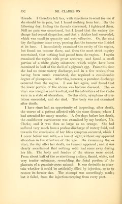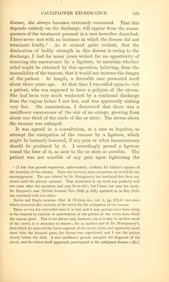 ![described, and distinguished from others, is something gained. All stimulating substances, cither in diet or medicine, seem to aggravate it by increasing the discharge] and no astringents internally given, which 1 have tried, appear to lessen it. The only means from which I have seen any benefit derived, is the injecting into the vagina three times a day, a strong decoction of cortex granati, or of cortex quercus, in which alum is dissolved in the proportion of eight or ten grains to every ounce of it. This has the double effect of Lessening the quantity of the discharge, and rendering it less offensive.1 It is scarcely necessary to add, that the use of anodynes must be resorted to for the1 mitigation of pain, and that the occasional symptoms of suppression of urine and costiveness are to be relieved by the use of a catheter and mild laxatives. Postscript. Read Jan. 8, 1811.—Since the foregoing paper was laid before the Society, a case of cauliflower ex- crescence, connected with pregnancy, has occurred in the practice of my brother, Mr. Clarke. Margaret Pole, aged 32, the mother of eight children, discovered that she was pregnant in the beginning of the year 1 [All writers agree in the propriety of the use of astringents as a palliative, and to moderate the excessive discharge; hut some seem to regard that as all that can he done, because of the failure of cure by the ligature. If the ligature he only applied around the root of the excrescence, and when it comes away if nothing more be done, there is little doubt that the disease will return, and in the end prove fatal. Jiut if, after removing the tumour by a ligature, we make a deep eschar on the spot from which it grew by nitric acid, caustic potash, or chloride of zinc, it is quite possible ''as in the case which came under my care) so to extirpate the disease that a permanent cure will be effected. Or, what is probably still more certain, if the substance Of the cervix and body <>f the uterus is free from disease, the uterus may be drawn down to the vaginal orifice by means of Moeeux's forceps, and the entire disease with a sufficient portion of the cervix removed by the scissors, as in lime. Boivin's and Professor Simpson's cases; or by ligature, as in Dr. Montgomery's CBSes, and in the one upon which I have recently operated. The ligature comes away in five or Bii days, and we avoid all chance of hemorrhage. It I excised the Cervix, I would certainly take the opportunity of applying the actual eauterv. Dr. Simpson places his patient on her face, with the legs hanging down over the edge of the bed, for the greater safcU and convenience of cutting from behind for- wards. Pot some weeks after the operation, it will he ad\isahle to use astringent injec- tions once or twice a day.— Bd. 1](https://iiif.wellcomecollection.org/image/b21030170_0546.jp2/full/800%2C/0/default.jpg)