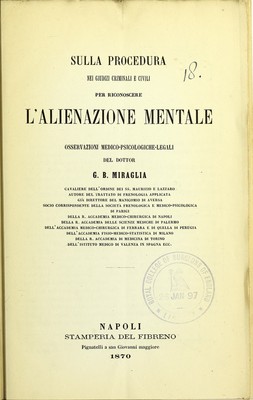 Sulla procedura nei giudizi criminali e civili per riconoscere l'alienazione mentale : osservazioni medico-psicologiche-legali / G.B. Miraglia.